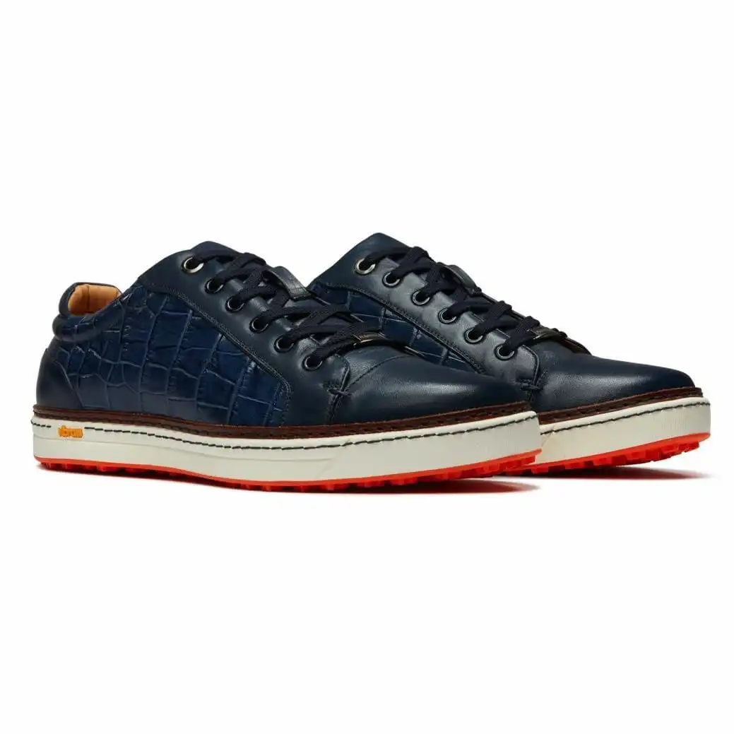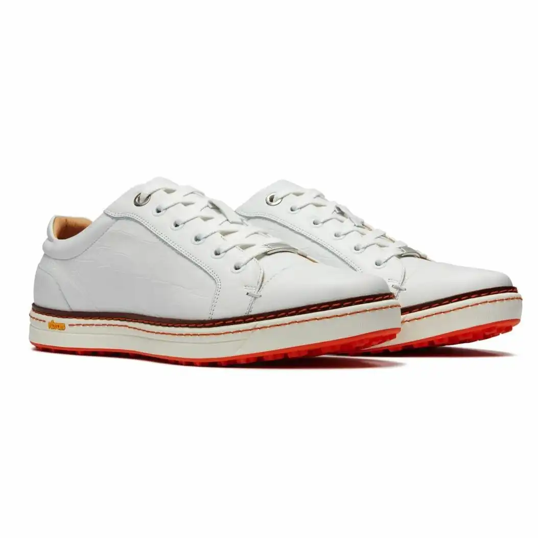 What happens when you blend modern street style and classic golf style? Introducing The Croco, Royal Albartross’ take on a sneaker made for golf. Casually cool, this white version is excellent for creating the crisp, clean work-to-golf look. Handcrafted with white croc-embossed leather, white eyelets, and silver detail, these handsome shoes are finished with the signature Orange Albartross sole.